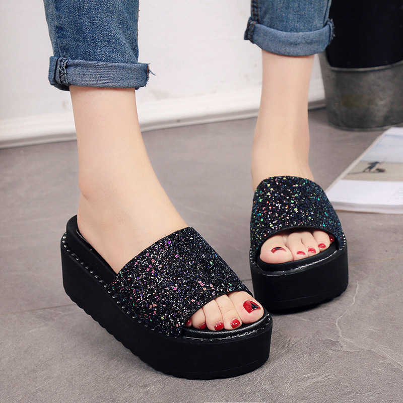 2023新款亮片凉拖鞋女夏外穿厚底坡跟松糕底一字拖凉鞋增高沙滩鞋