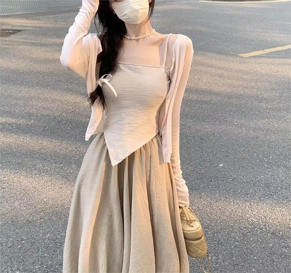 纯欲不规则抹胸长袖连衣裙女夏季茶歇法式收腰a字长裙三件套裙子
