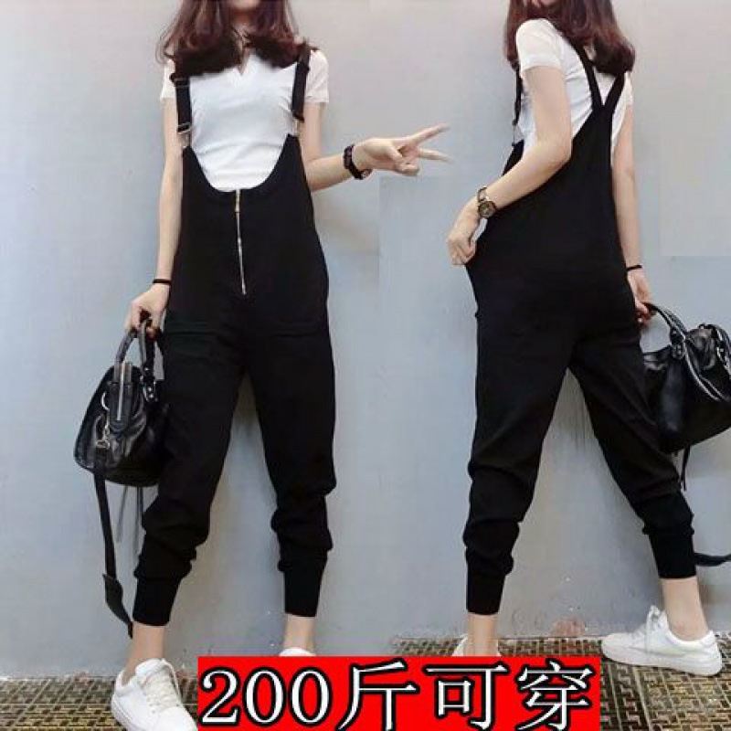 大码女装宽松显瘦200斤胖mm小个子遮肚背带裤胖妹妹学生哈伦裤