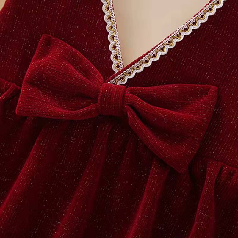 女童春春季裙子2023新款蝴蝶结甜美纯色中大儿童公主裙红色两件套
