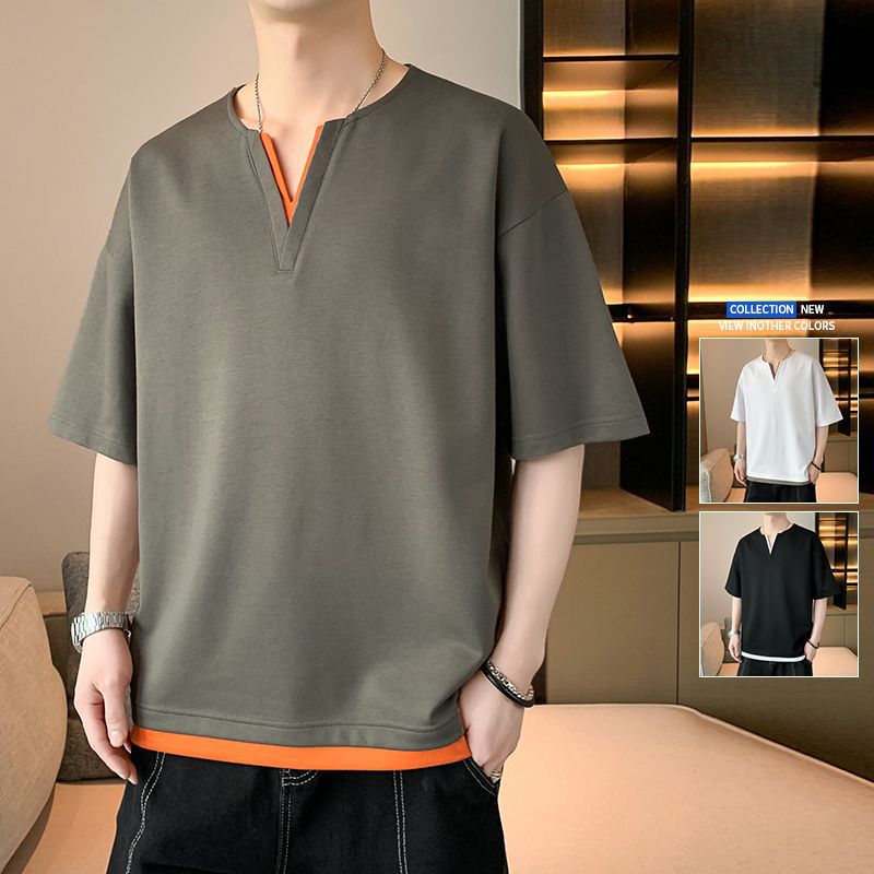 2023年夏季宽松假两件t恤男V领短袖ins港风半袖上衣百搭休闲体恤