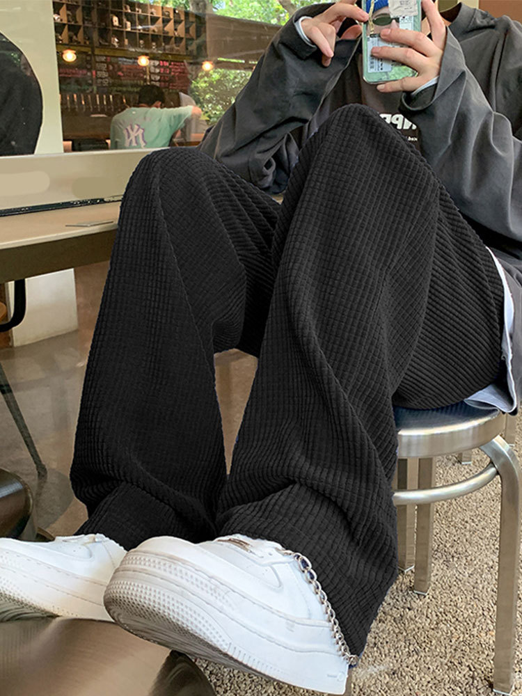 黑色华夫格卫裤女秋冬高腰直筒大码胖mm宽松显瘦休闲阔腿裤子潮