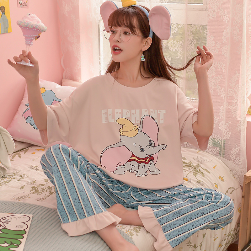 2023夏季新款纯棉睡衣女可爱风家居服可外穿小象圆领短袖长裤套装