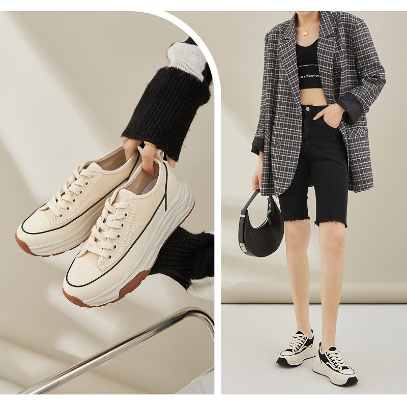 小众厚底系带帆布鞋女2023年新款低帮平底小白鞋女休闲溶解板鞋