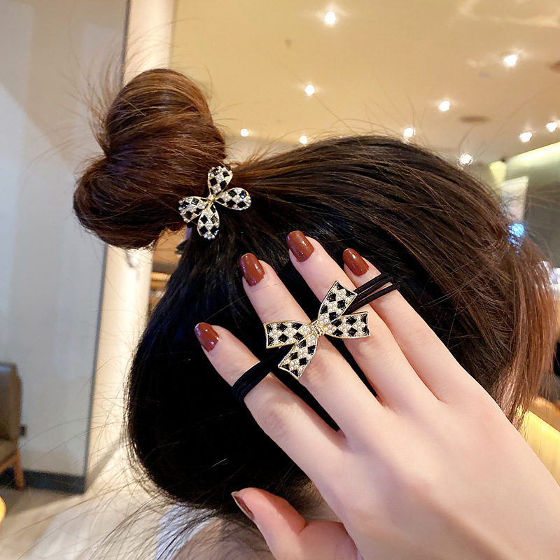 韩国棋盘格子蝴蝶结珍珠头绳女扎头发马尾发圈简约气质丸子头发饰