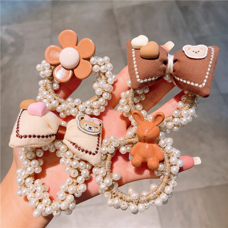 韩版儿童奶咖蝴蝶结珍珠发圈小女孩卡通扎头发女童丸子头皮筋头绳