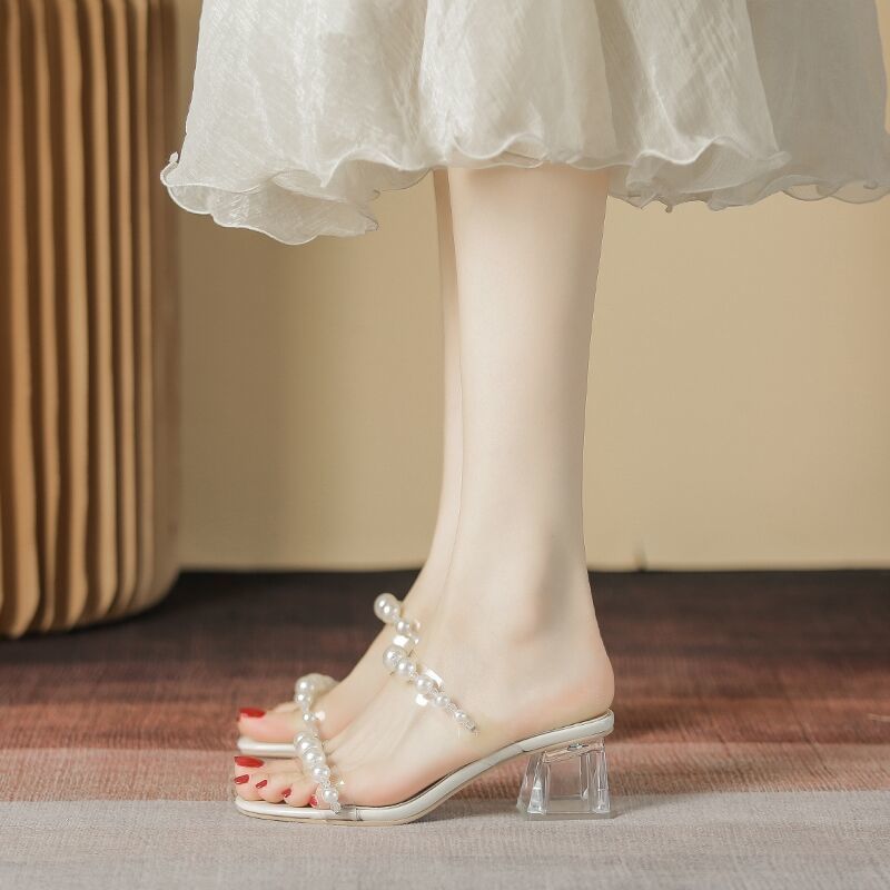 仙女风2023年新款水晶中跟珍珠凉鞋粗跟高跟鞋百搭露趾凉拖鞋女款