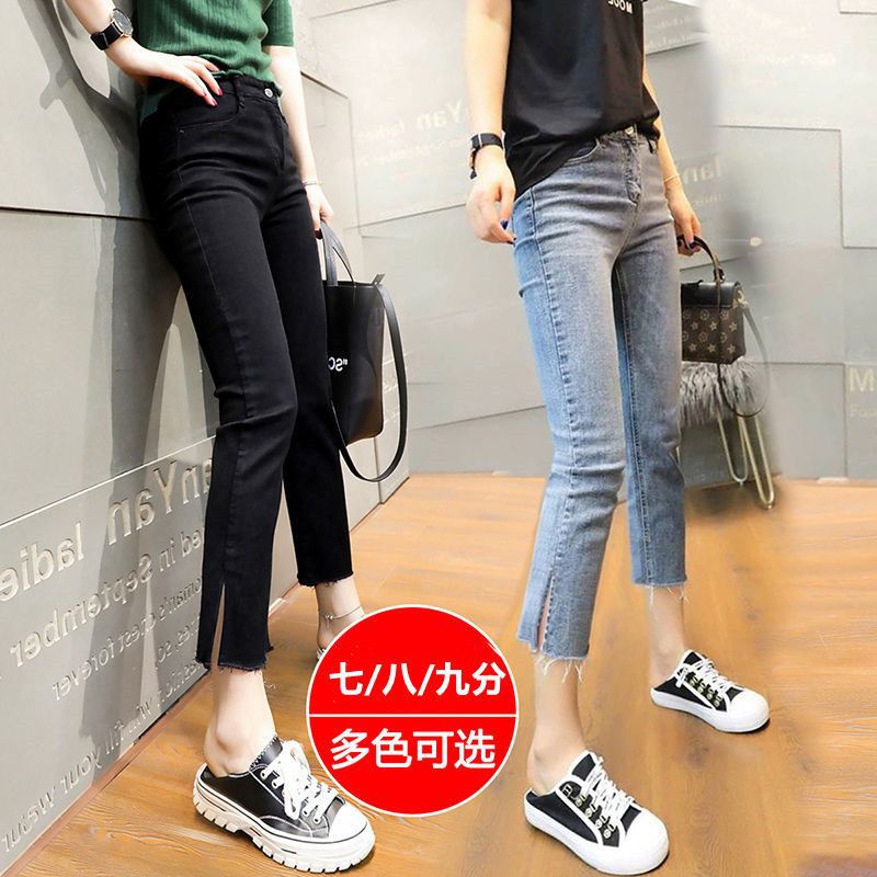七分直筒牛仔裤女开叉2023夏季薄款高腰显瘦黑色八分小个子烟管裤