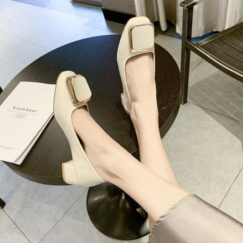 新款单鞋女2023春款潮鞋白色平底中跟粗跟方头百搭高跟豆豆春秋季
