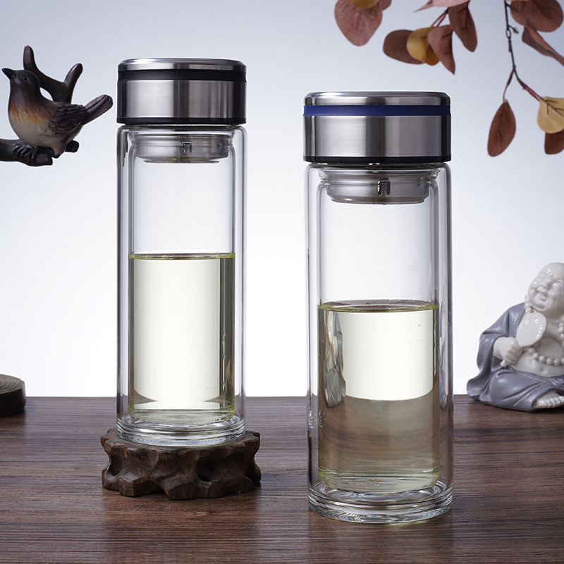 玻璃杯双层带盖男士厚底水杯透明高硼硅玻璃耐高温隔热杯子