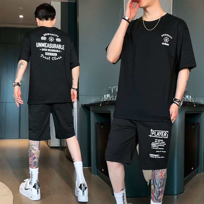 2023夏季新款短袖男T恤纯棉运动休闲套装潮流ins青少年印花体恤潮