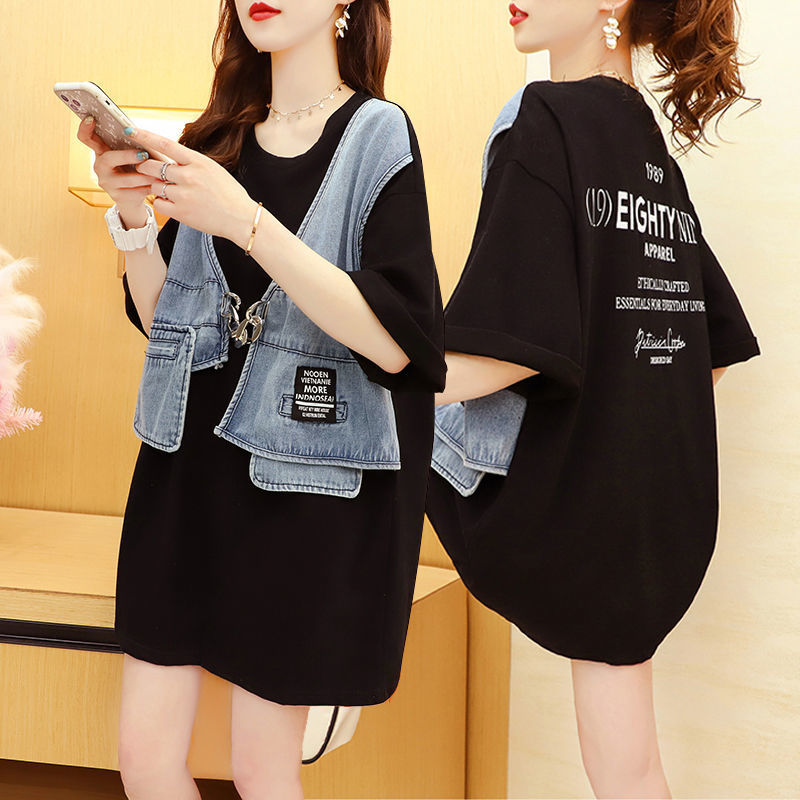 中长款网红假两件短袖T恤女2023夏季新款宽松大码半袖体恤衫上衣