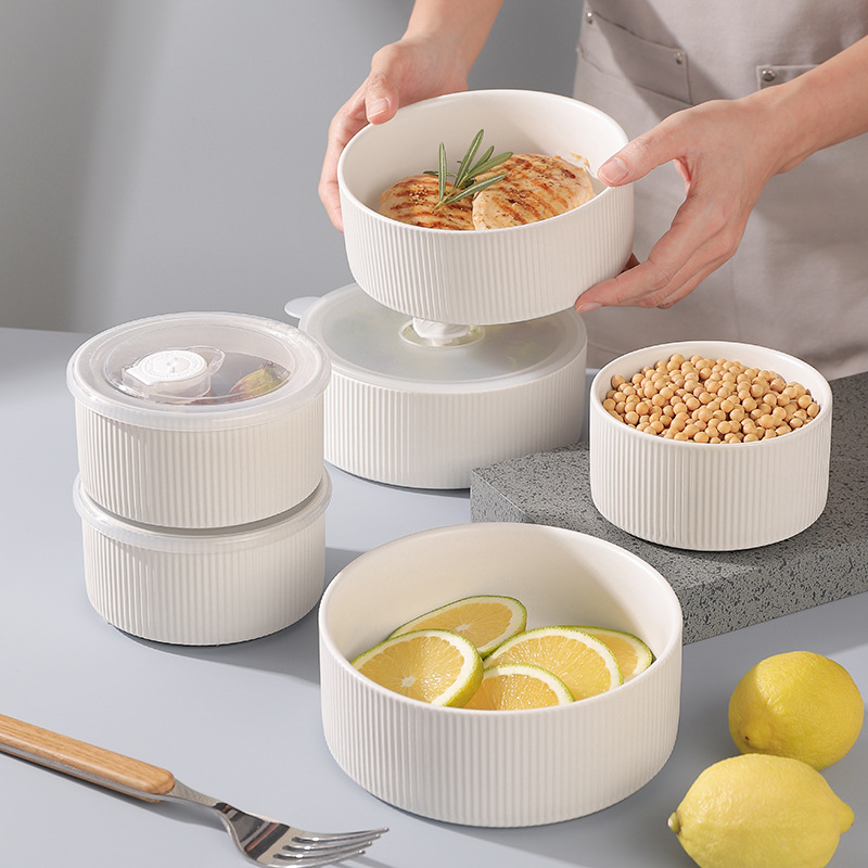 北欧便携保鲜碗饭盒陶瓷碗带盖上班族便当可微波炉加热冰箱保鲜盒