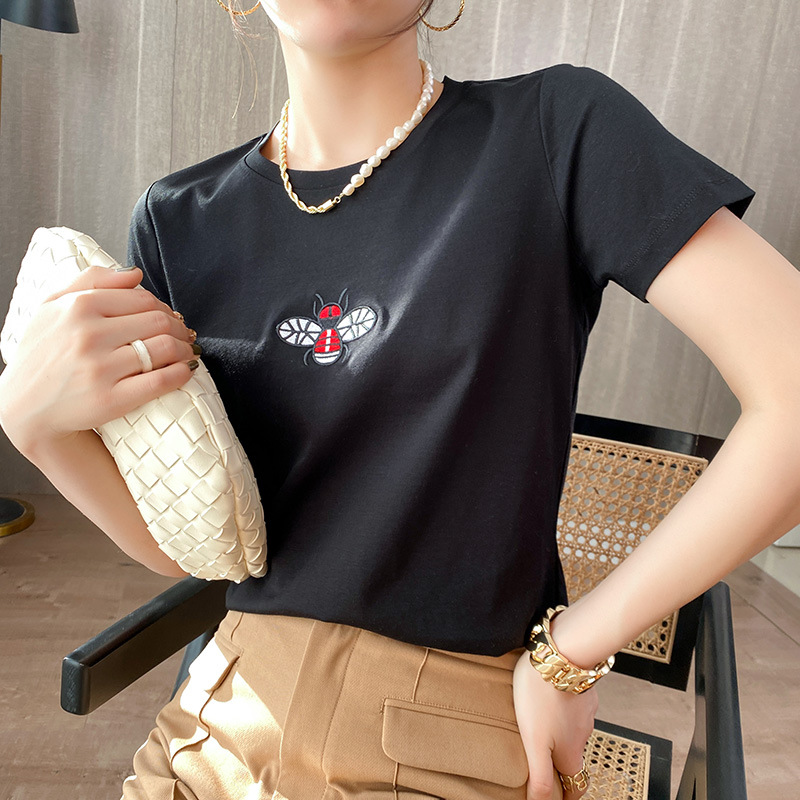 80支丝光棉短袖t恤夏季纯棉白色刺绣短袖宽松圆领半袖打底衫上衣
