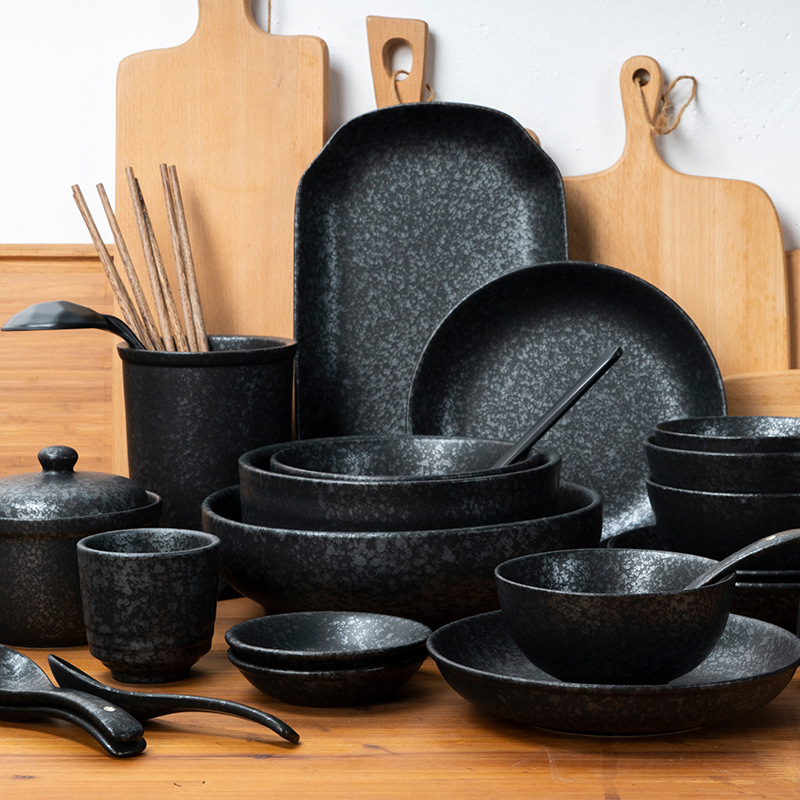 T釉下彩陶瓷盘碗碟勺家用餐具套装黑色珍珠哑光日式菜盘鱼盘料理
