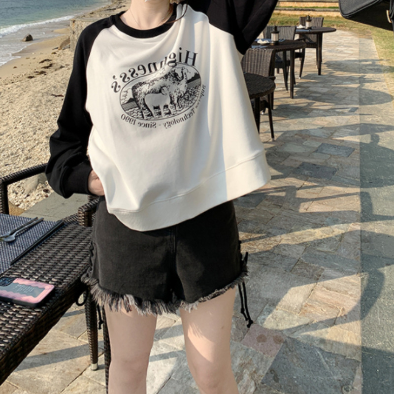 微胖大码胖mm百搭复古撞色卫衣女2023春季宽松显瘦圆领休闲上衣