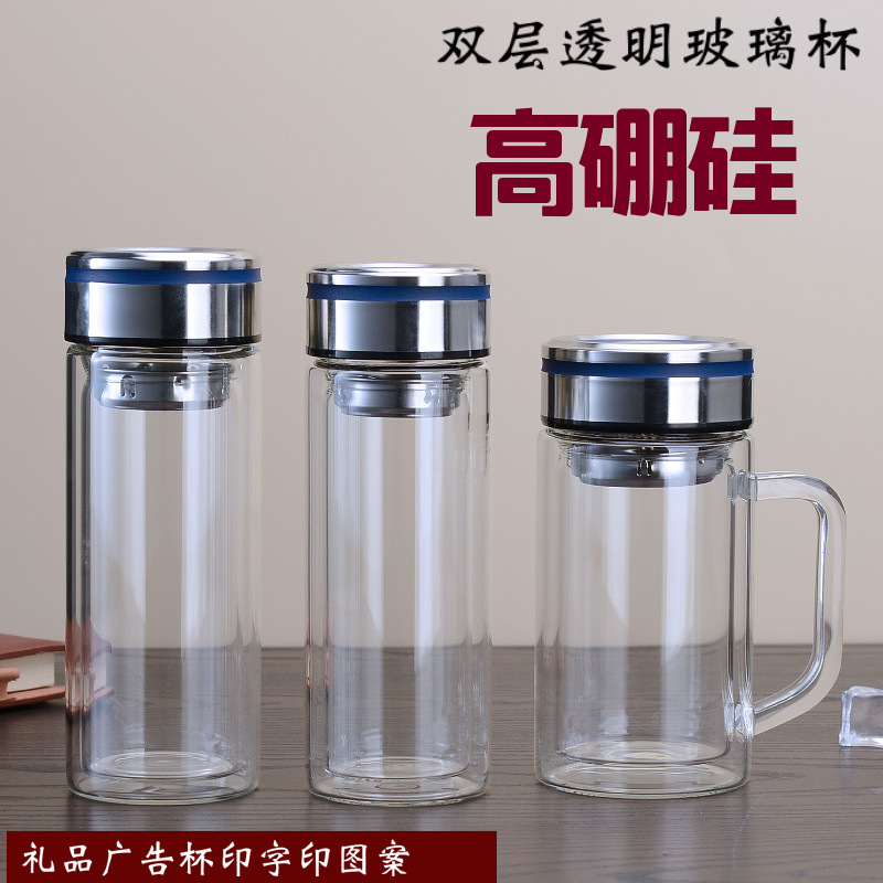 喝茶水杯家居玻璃杯办公室双层礼品杯子直筒带盖玻璃百货代发