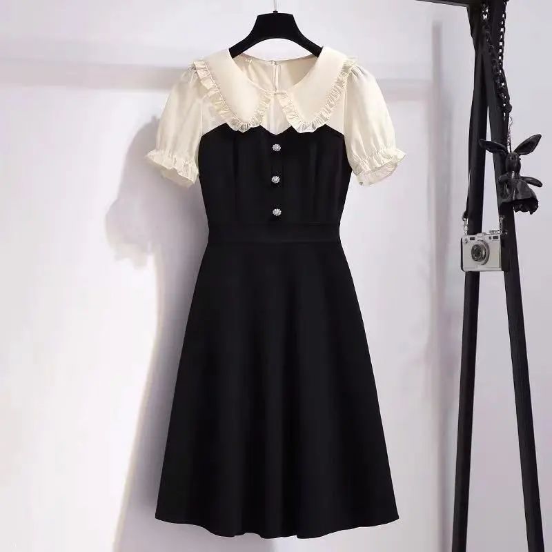 大码女装2023夏季新款赫本风气质收腰显瘦娃娃领拼接假两件连衣裙