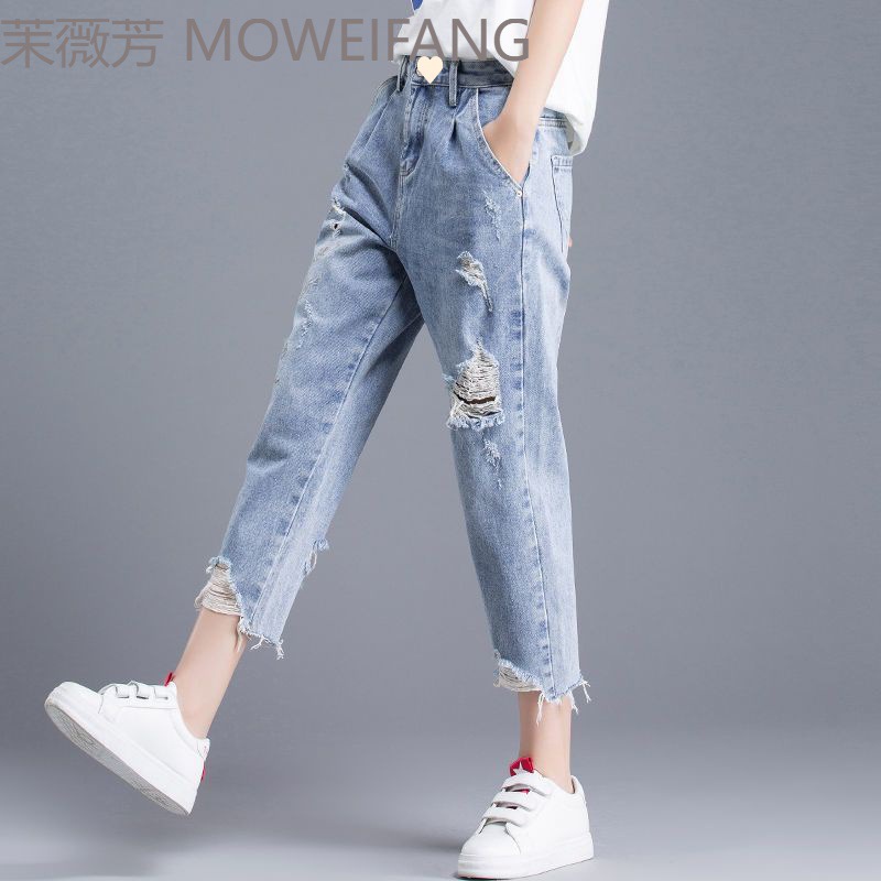 破洞牛仔裤女2023年春夏薄款宽松裤子女显瘦百搭哈伦裤八分九分裤