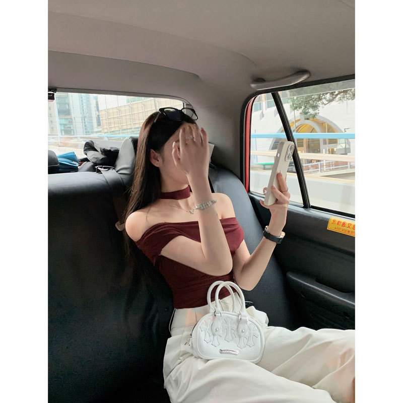 早安樊樊 飘带一字肩t恤女温柔抽褶洋气显瘦气质设计感韩系上衣