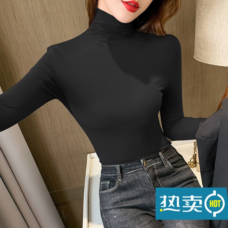 莫代尔高领打底衫女2022春季新款百搭长袖t恤修身内搭堆堆领上衣