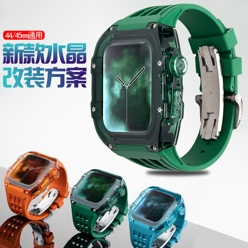 适用苹果手表改装壳Apple Watch S8保护壳氟橡胶表带水晶透明表壳