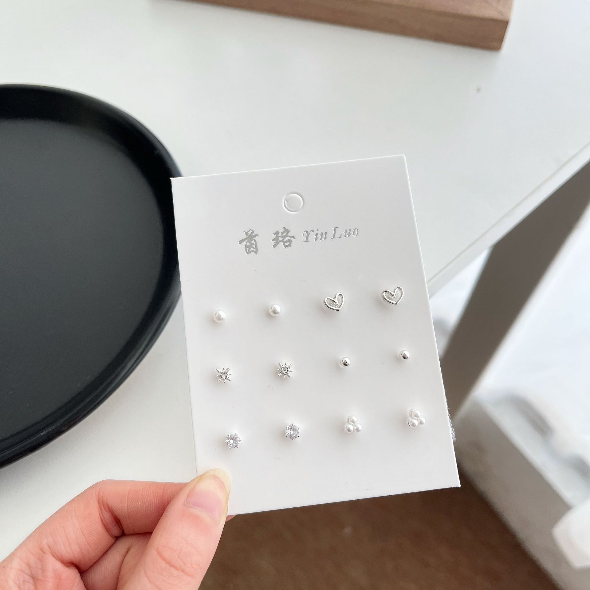 S925银针几何耳钉套装女甜美小巧精致珍珠爱心耳环简约百搭耳饰