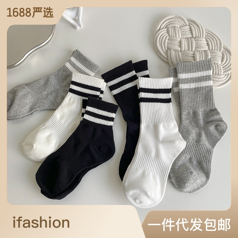 春秋季袜子女中筒袜纯棉韩版学院风二杠长袜ins潮学生运动袜条纹