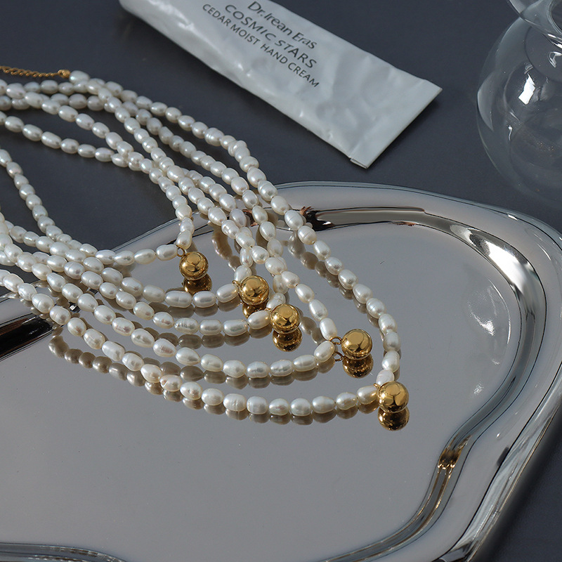 法式ins风复古轻奢气质款淡水珍珠钢珠吊坠项链钛钢镀18K金 P104