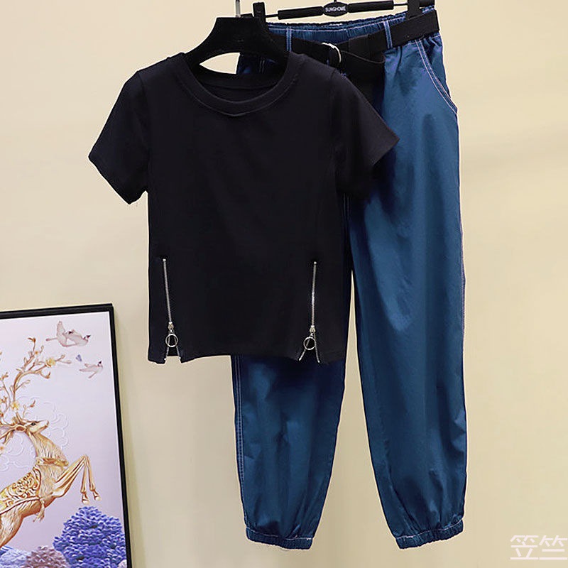 大码女装夏季套装女2023新款短袖T恤女遮肚显瘦百搭休闲裤两件套