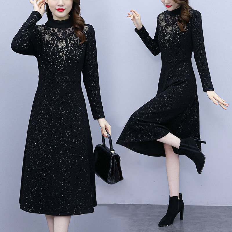 黑色蕾丝连衣裙2023春秋新款时尚洋气减龄遮肚显瘦中长款打底裙子