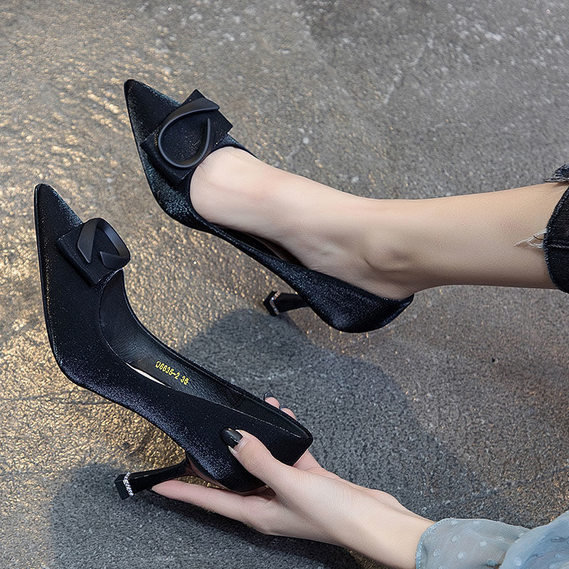 法式小高跟鞋女细跟7cm中跟鞋新款百搭气质单鞋女浅口尖头鞋