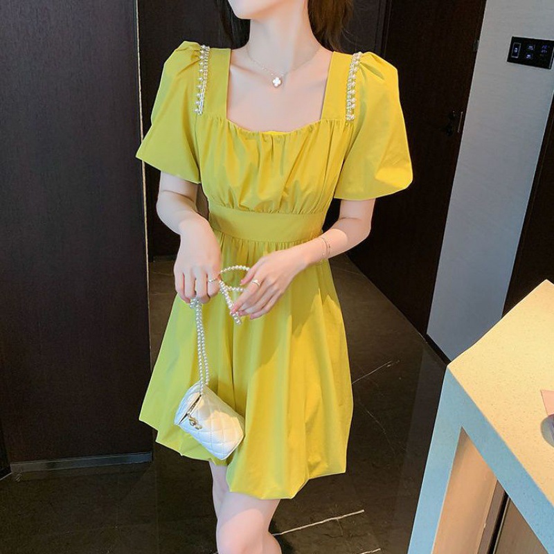 2023夏季新款法式方领钉珠泡泡袖连衣裙女收腰显瘦小个子蓬蓬裙子