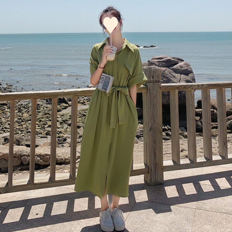 法式绿色衬衫裙连衣裙女夏高级感小众设计长裙洋气减龄轻熟温柔