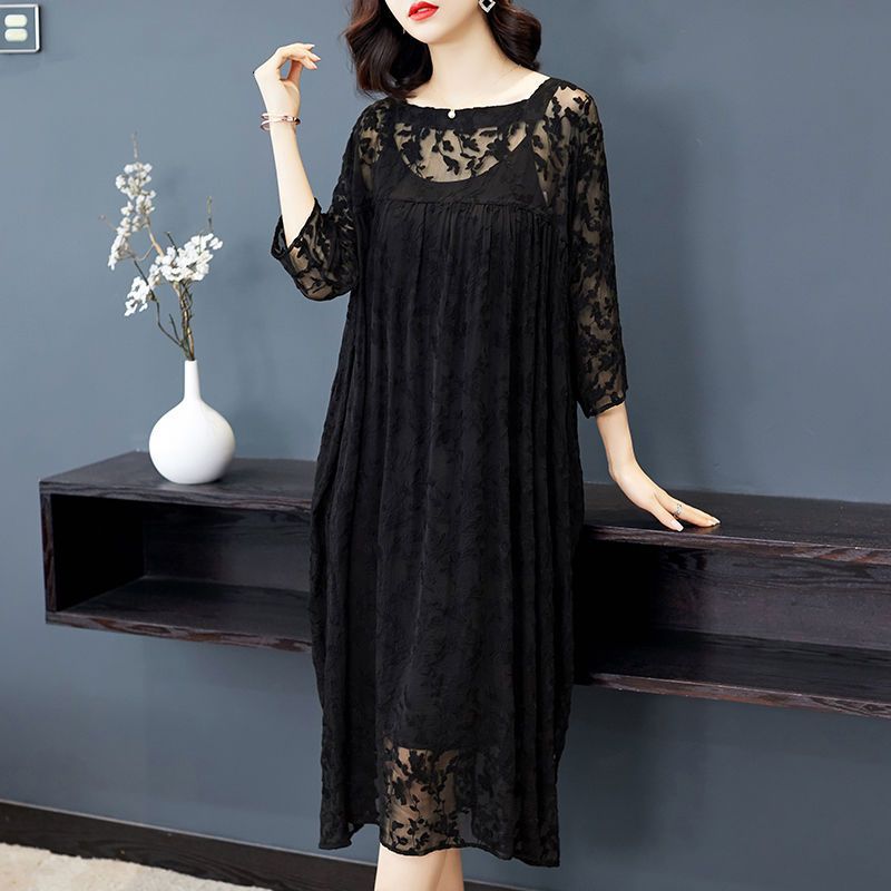 黑色蕾丝大码连衣裙女2023夏季新款妈妈装气质宽松显瘦中长过膝裙