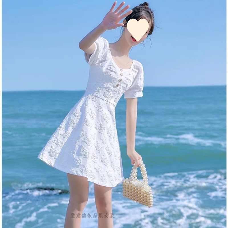 2023夏季新款短袖甜美设计感仙女小众白色连衣裙高腰收腰显廋短裙