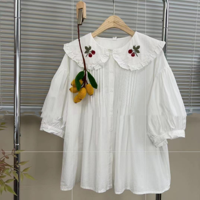 2023夏季新款五分袖衬衣韩版宽松显瘦遮肚子重工刺绣娃娃领衬衣女