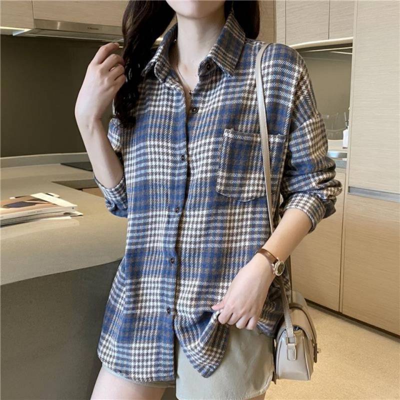 磨毛衬衫格子衬衫女复古秋装新款宽松衬衣春秋长袖设计感磨毛