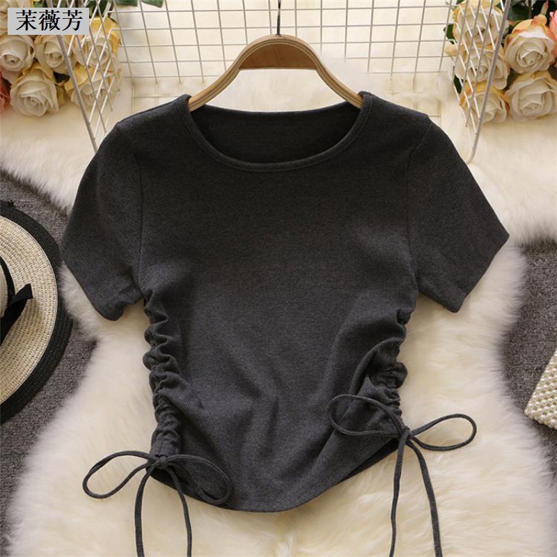 网红气质棉恤女短袖韩版2023新款圆领抽绳显瘦百搭上衣女