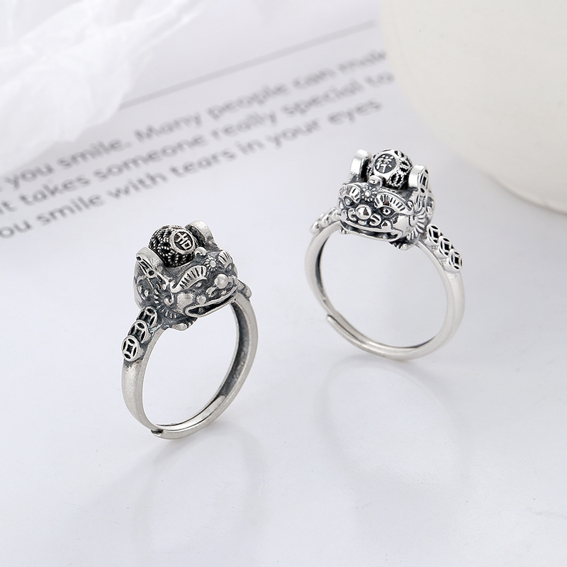 云潮轩S925纯银亚光做旧吉祥貔貅打麻将赢钱神器时来运转开口戒指