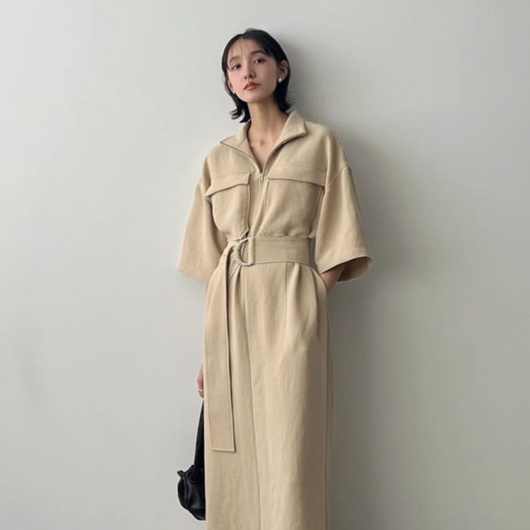 松本惠奈立领拉链H型工装裙连体裙宽松显瘦束腰五分袖