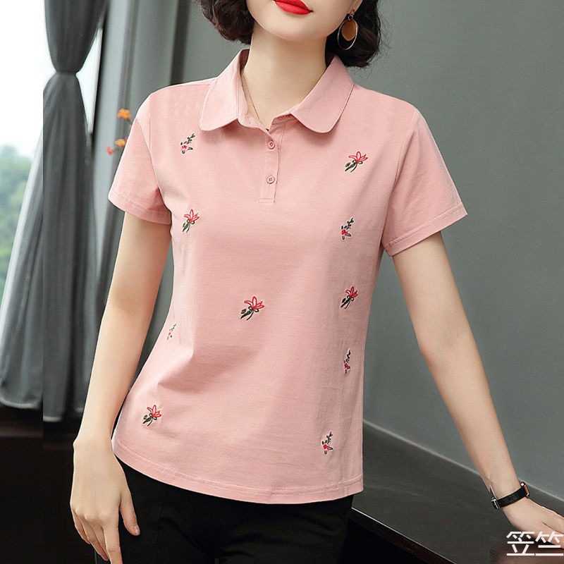 中老年妈妈T恤女短袖2023年夏装新款polo领打底衫女洋气减龄上衣