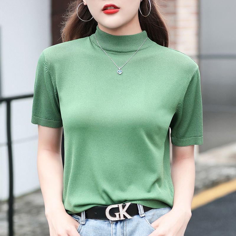 冰丝针织衫短袖宽松T恤上衣女潮夏季韩版纯色简约半高领女装体恤
