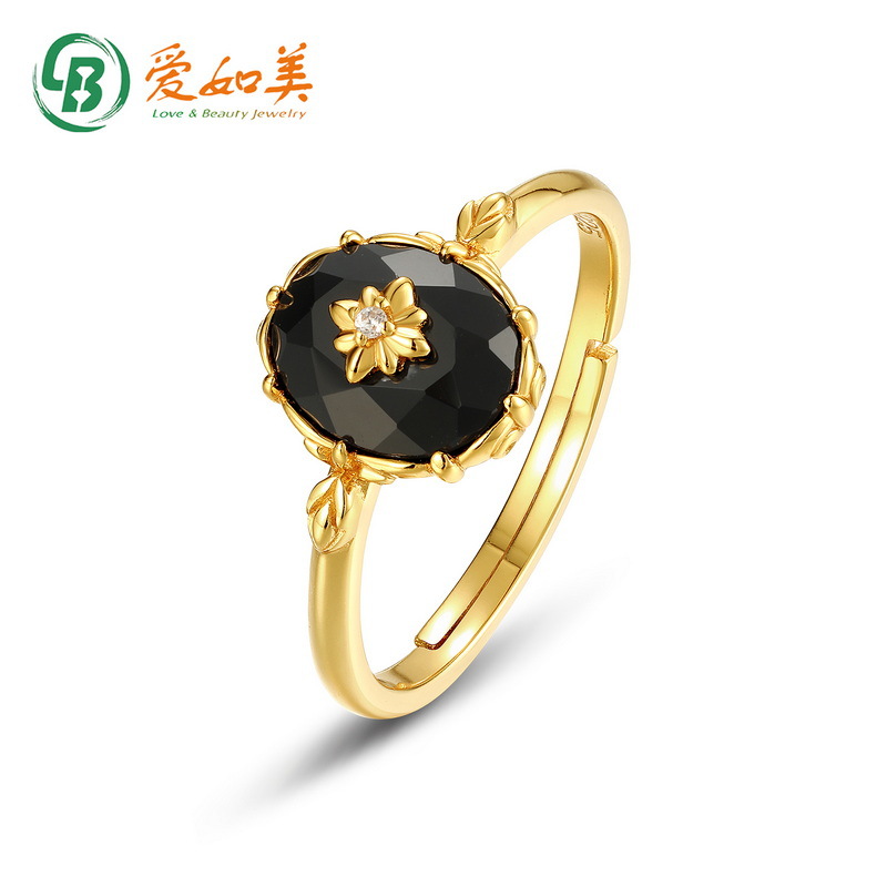 2023新款日韩风时尚流行黑玛瑙戒指复古花纹S925纯银戒指一件代发