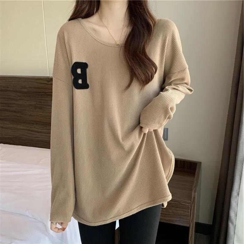 设计感螺纹长袖T恤女设计感中长款慵懒风韩版上衣宽松内搭打底衫
