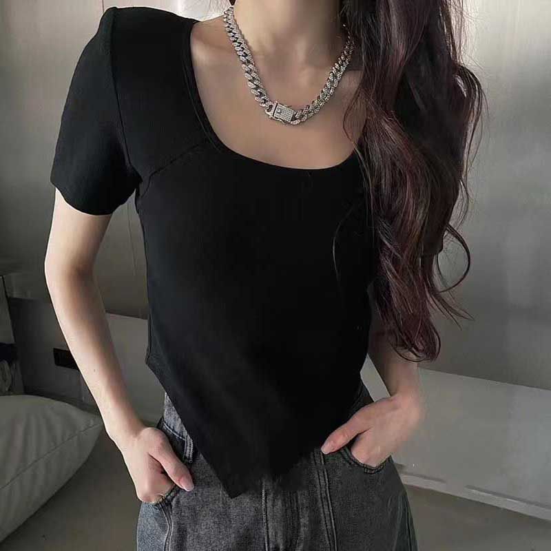 辣妹不规则短袖恤女2023年夏季新款打底衫修身内搭纯色恤上衣潮