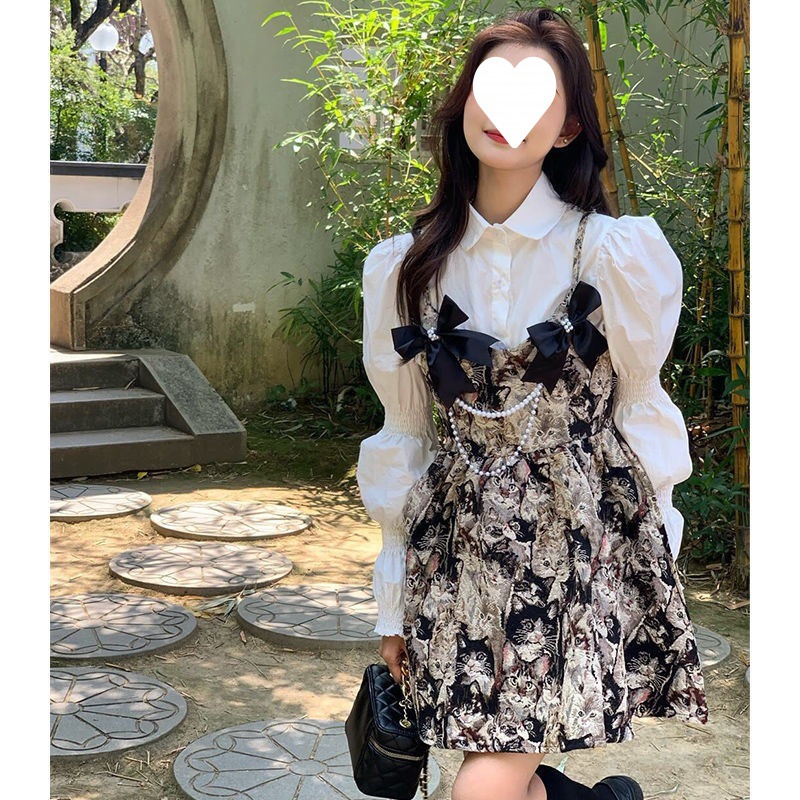 春秋复古港风轻熟长袖衬衫上衣+猫咪吊带连衣裙两件套套装女