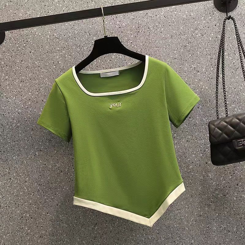 大码女装2023夏季新款显瘦遮肚修身上衣胖妹妹不规则方领短袖T恤