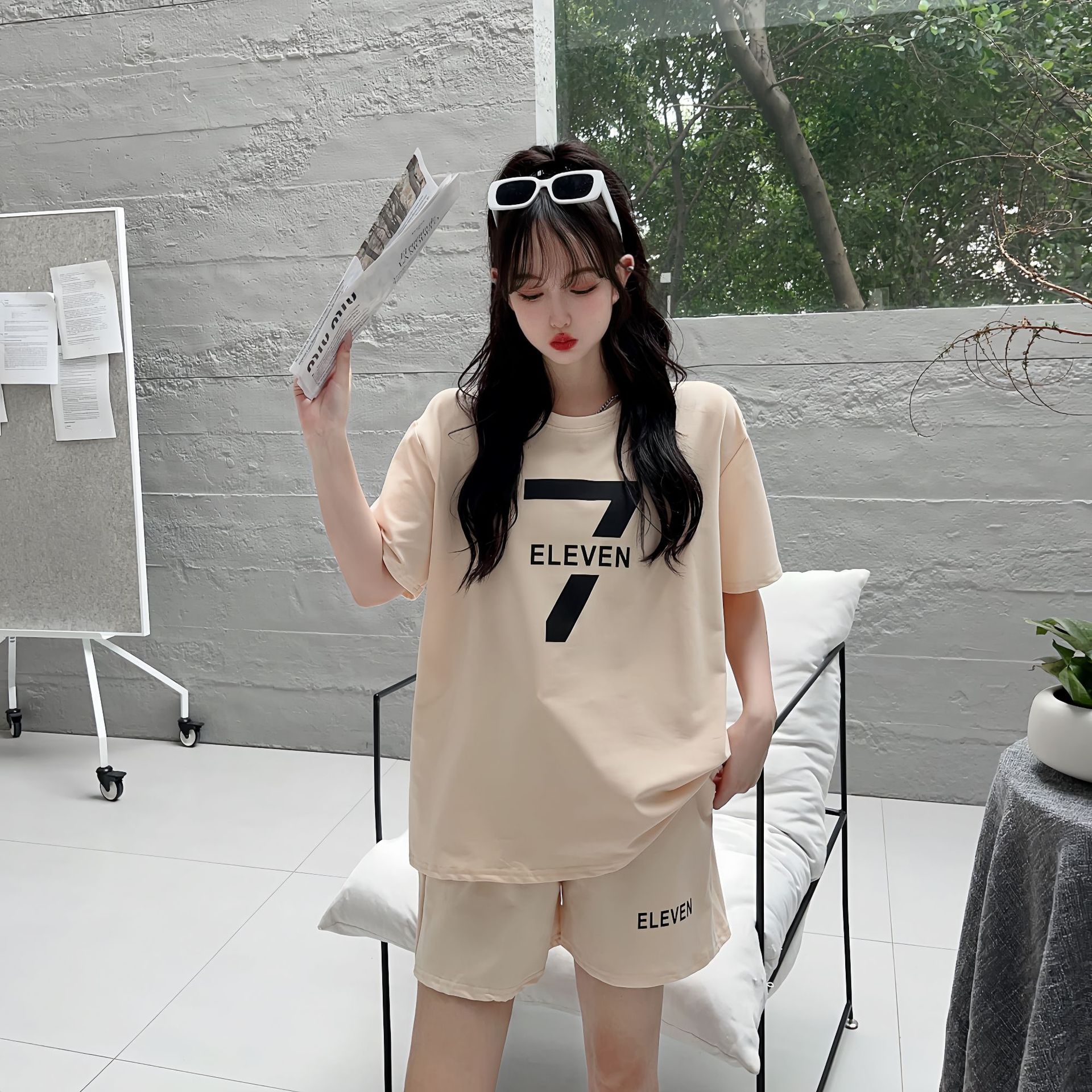 夏季新款圆领正肩印花短袖短裤两件套装女 宽松休闲运动套装女装