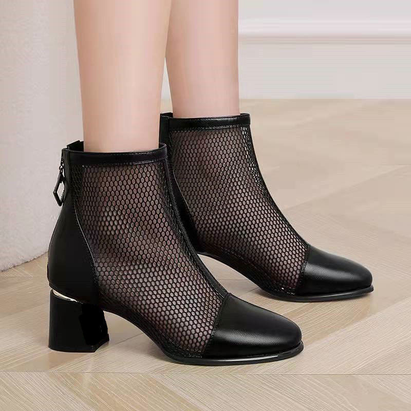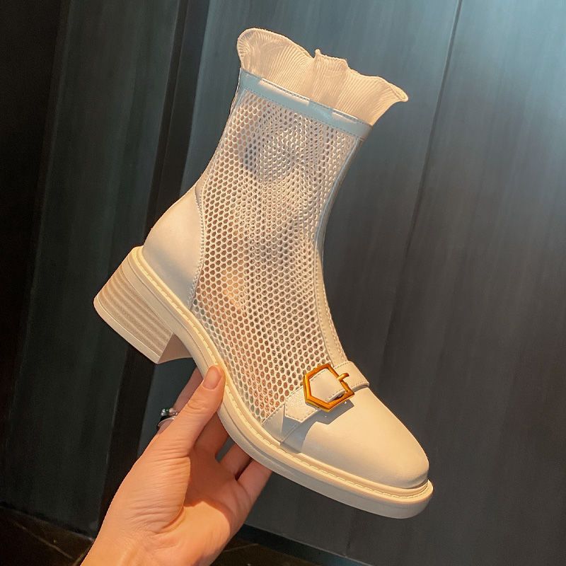 粗跟网靴女2023夏季新款网红镂空网纱马丁靴薄款透气中高跟女凉靴